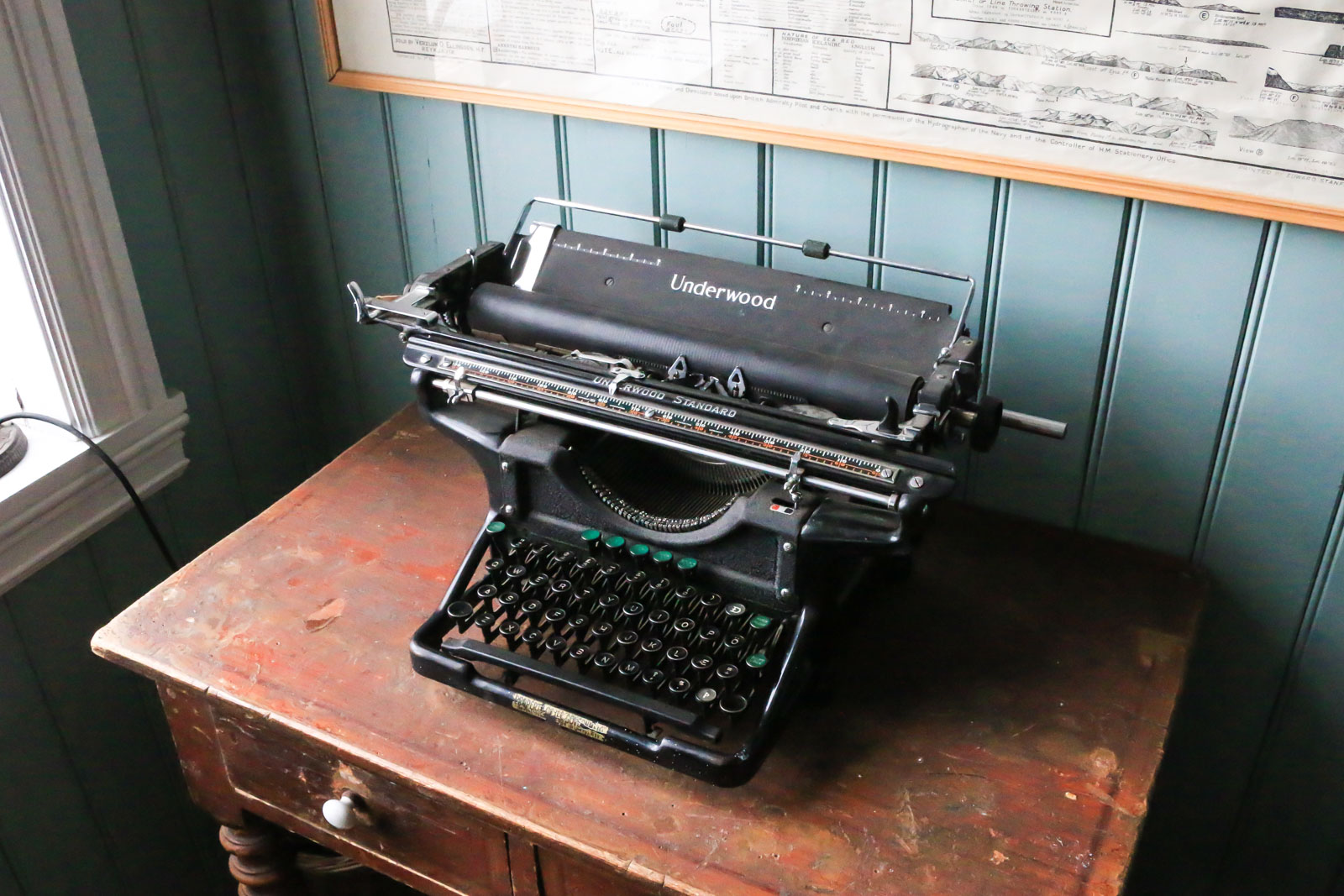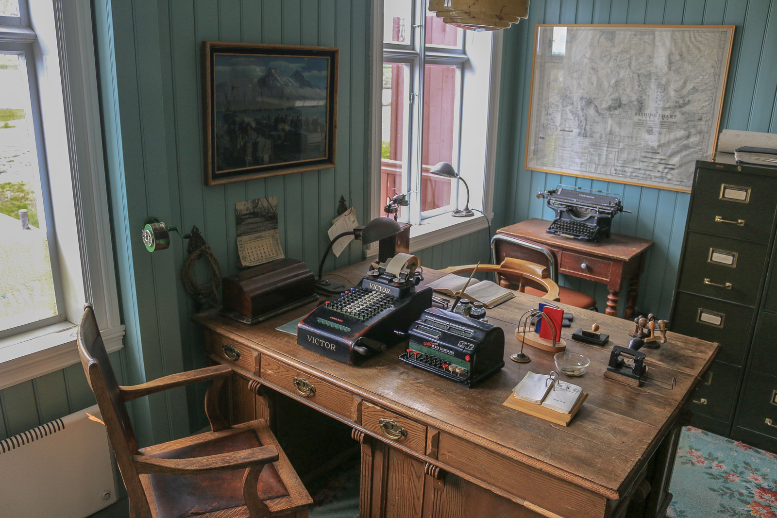 Hier finden sich Möbel und Gegenstände aus dieser Zeit. Eine alte Schreibmaschine der Firma Underwood hat sofort mein Herz erobert. Sie erinnert mit dem Namen an den Hauptcharakter in der US-Serie House of Cards. Im nachempfundenen Büro der damaligen Zeit, stehen Büsten des norwegischen Königs und der Königin, davor ein Globus.