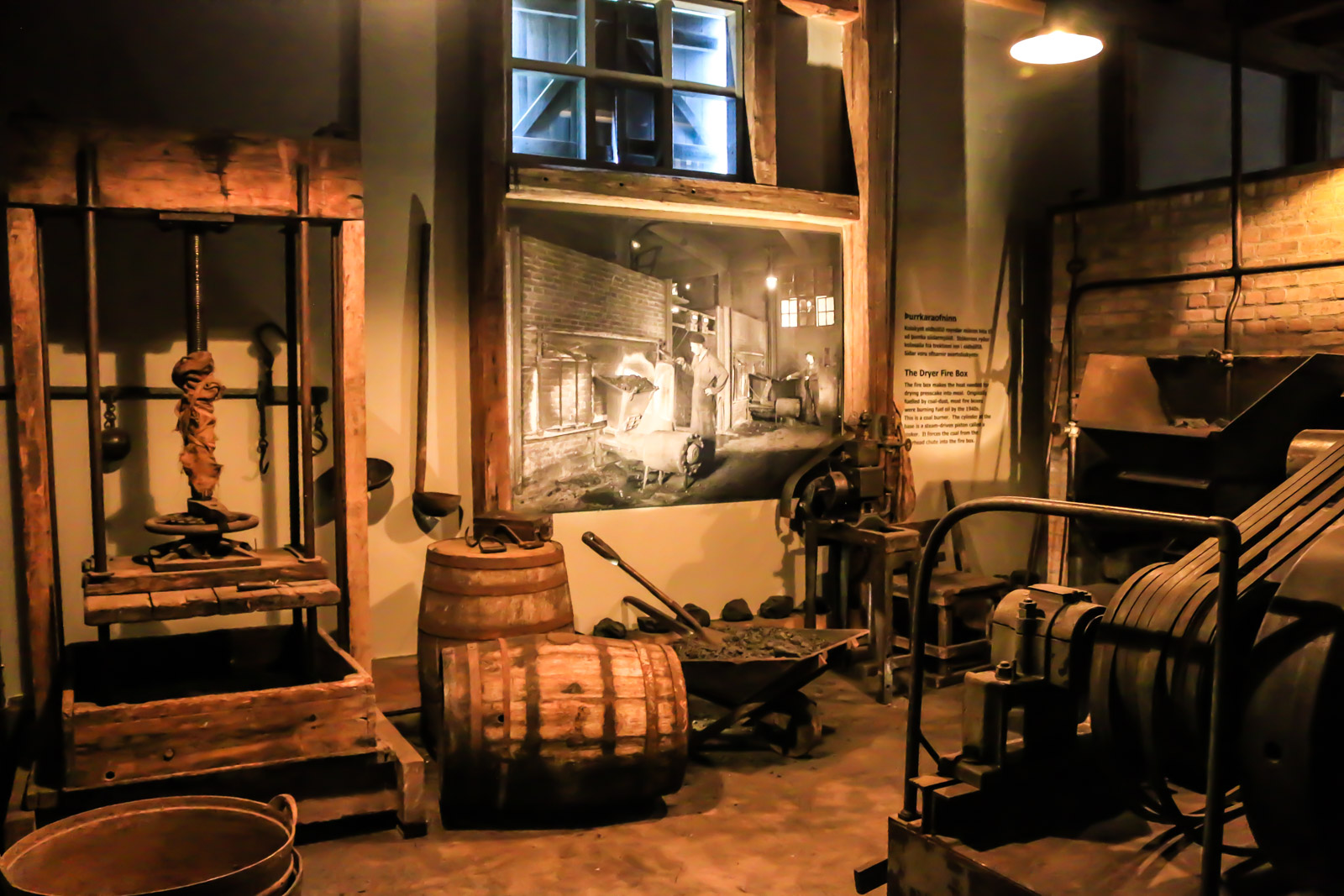 Ein Stockwerk tiefer finden man indes alte Reliquien aus den Fischfabriken – von den Etikettiermaschinen bis zu den Fässern mit Pökelsalz. Im Nebengebäude sind auch die Maschinen aus der damaligen Zeit ausgestellt. Hier wird auch erklärt, wie man das Fischöl aus den Heringen gewann. Auch finden sich hier die Erklärungen, wie viele Fischfabriken und Häfen es im Norden Islands einmal gab. Hier wird mir dann auch bewusst, dass ohne den Fischfang viele der Orte hier gar nicht existieren würden.