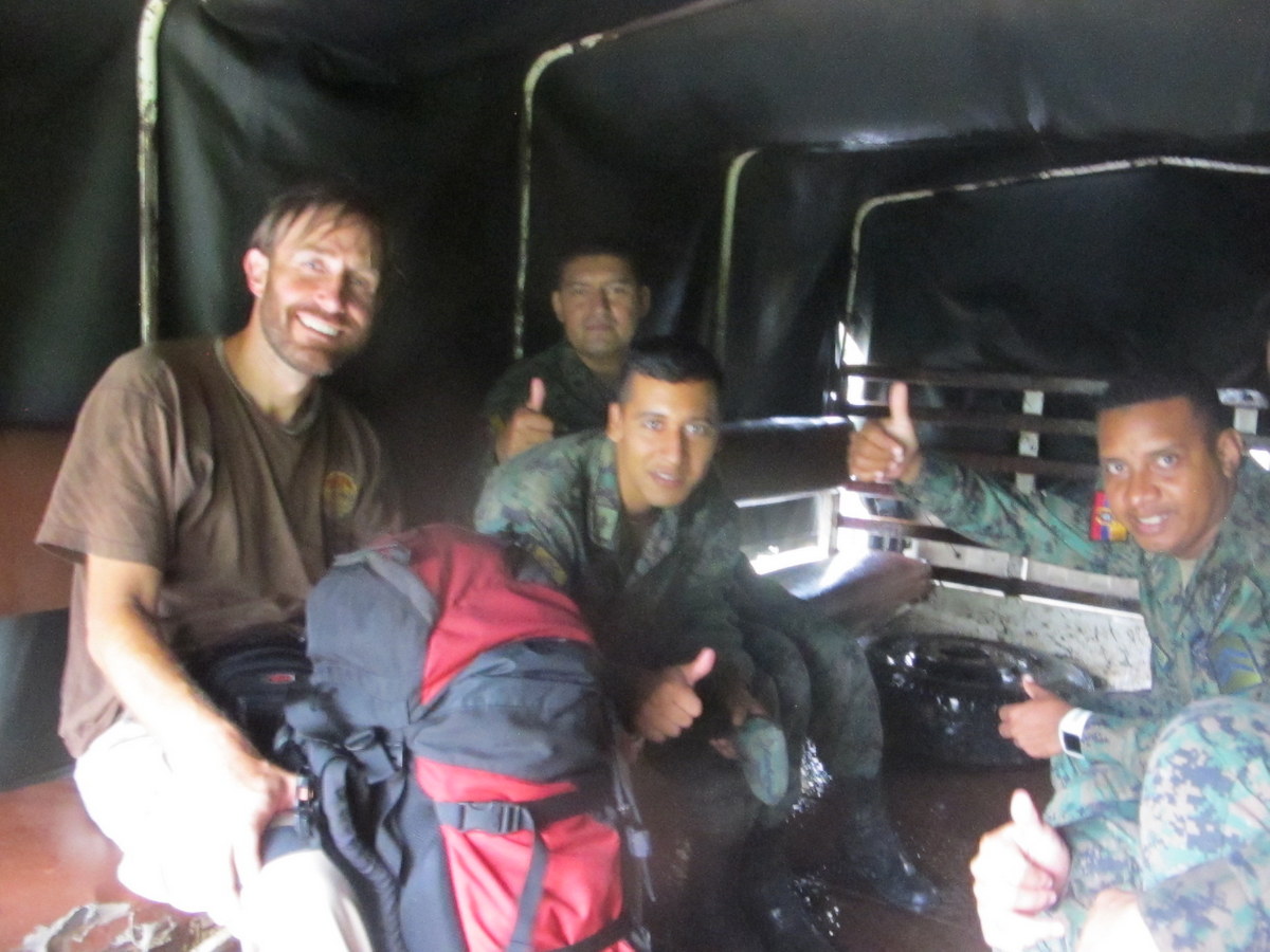 Die Grenze zwischen Kolumbien und Ecuador ist ungewöhnlich. Schnell aufgebaute Hütten aus Sandsäcken wirken wie ein Provisorium, ansonsten ist die Grenze, wie an vielen Stellen in Südamerika ungesichert. Man muß sich selbst um einen Stempel mühen, es gibt keine Kontrollen. Sichere, befriedete Grenzen. Ähnlicher Lebensstandard auf beiden Seiten. Erst einmal nimmt mich die Armee mit. Ich erzähle nicht, dass ich mich in Deutschland mit 23 Krankenscheinen vor dem Wehrdienst gedrückt habe, wie auch, mit meinem schlechten Spanisch. Außerdem ist es lange her. Wir teilen die LKW-Ladefläche, die auf schlechten Holzbänken ziemlich hart ist und auf die es reinregnet und ich weiß, dass es eine gute Idee war, nicht zu dienen.