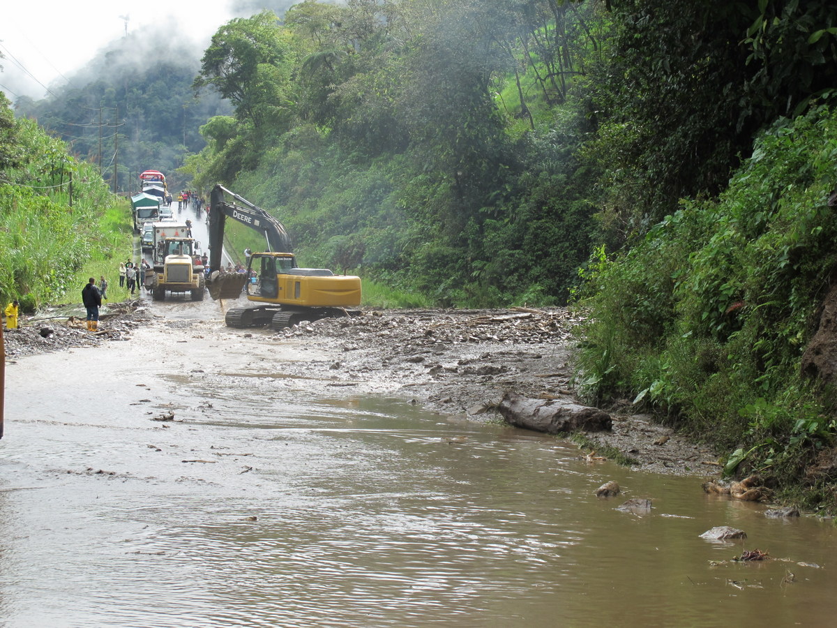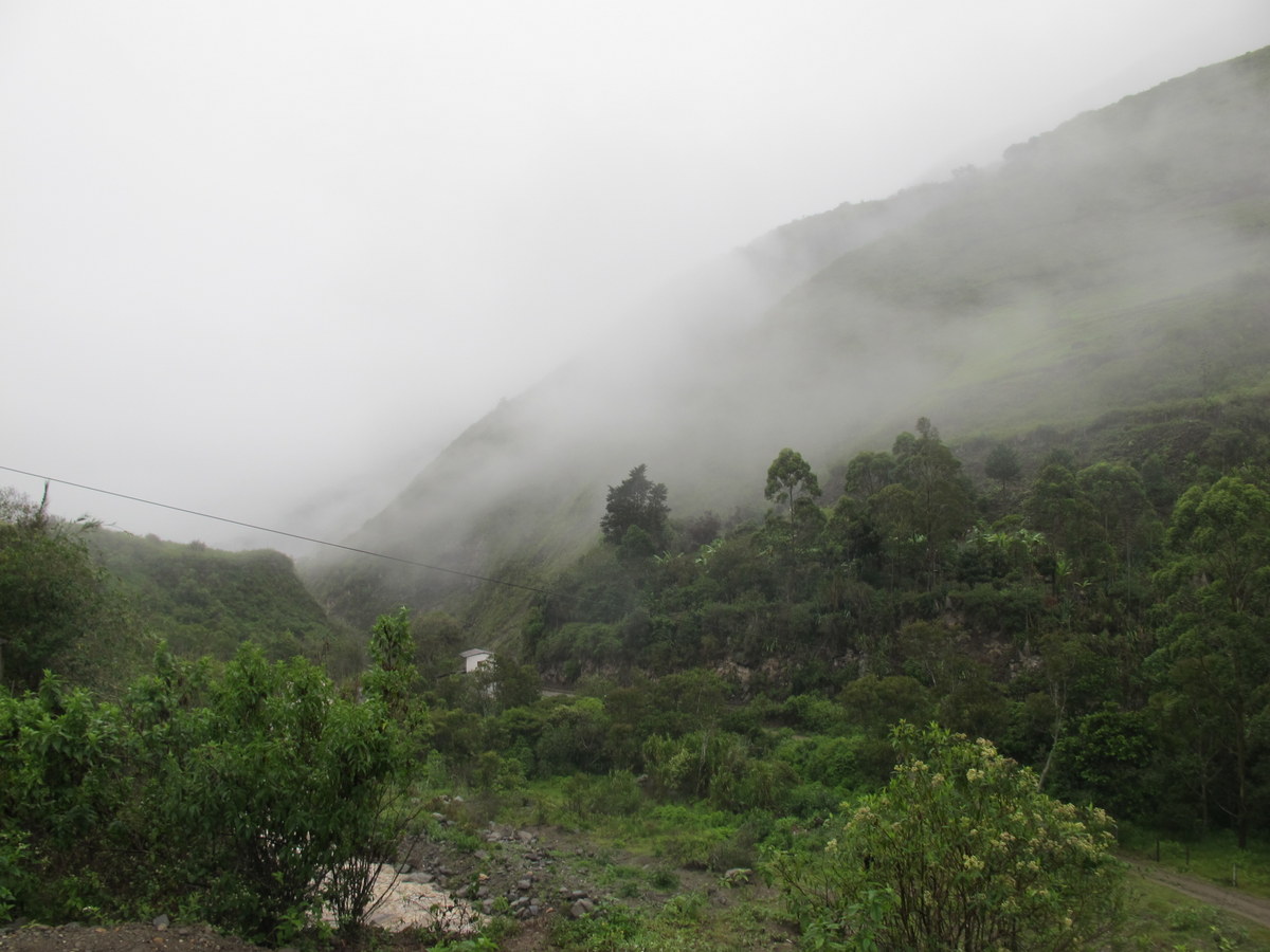 Ecuador hat unglaubliche Landschaften. Ein bergiges Land, mit tropischem Regenwald, Wasserfällen. Die Fahrt durch die Berglandschaften mit unendlich vielen Grüntönen, sogar durch die Wolken. Vorbei an Erdölpumpen, die hier mitten im Paradies stehen und durch Flüsse, die über die Straße fließen. Einmal wird ein solcher Fluss allerdings zur unüberwindlichen Barriere. Ein Erdrutsch hat die gewaltige Betonröhre verstopft, durch die das Wasser normalerweise unter der Straße hindurchfließt. Also fließen die Wasser und Schlammmassen über die Straße und machen sie unpassierbar. Nach Stunden und nur mit Hilfe schwerer Technik, gelingt es, den Weg wieder frei zu machen.
