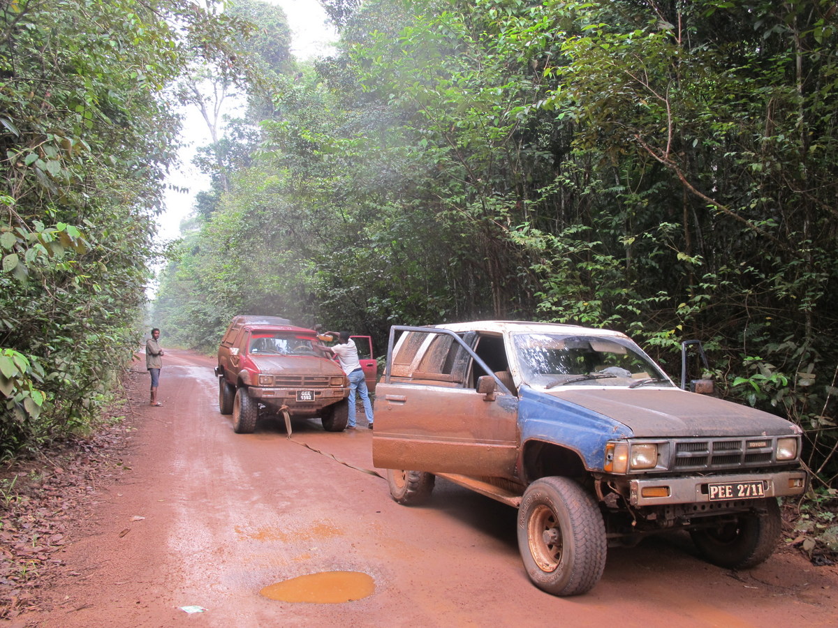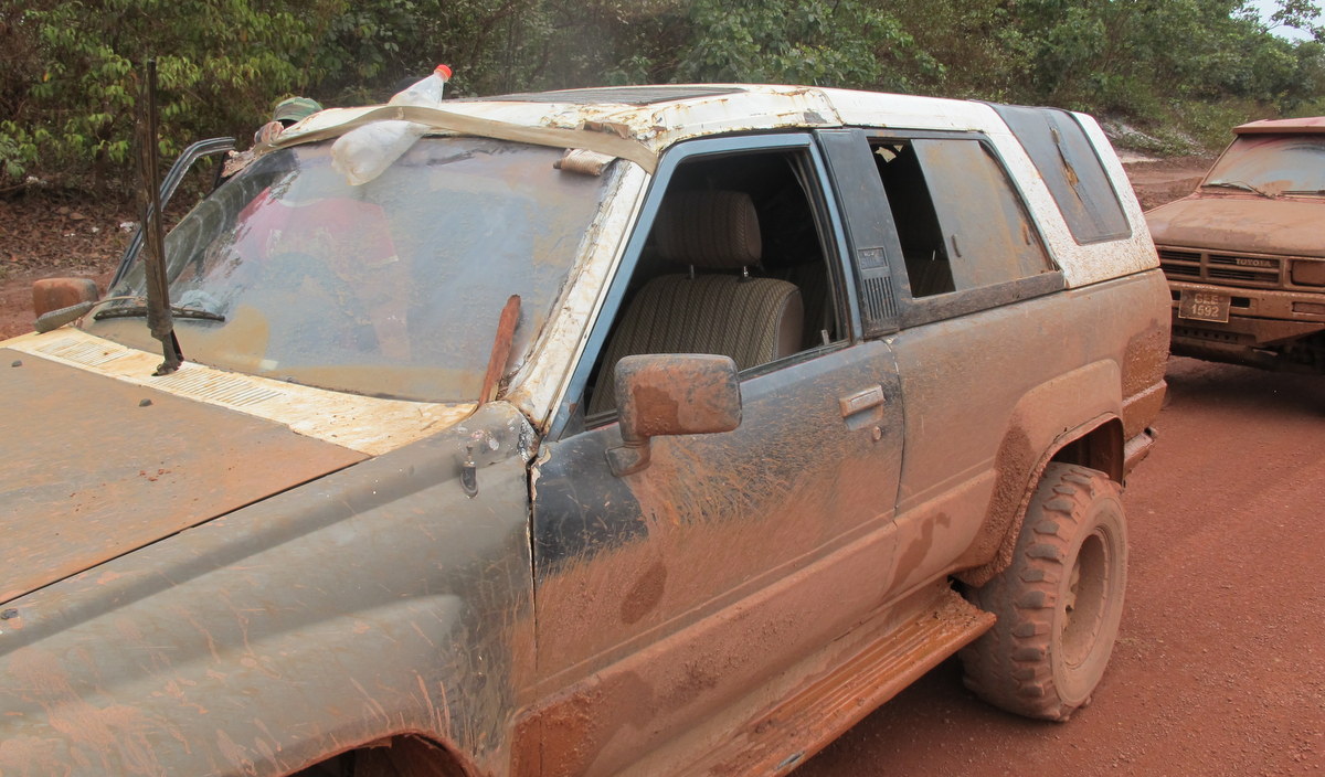 Am nächsten Morgen ging dafür alles ganz schnell: Zurück nach Georgetown, vorbei an Bauxitminen nach Linden und wieder auf die Piste. Zuerst fahre ich mit alten Militär-LKWs mit. Praktischerweise haben die Halterung für das MG auf dem Dach. Immer sind sie mit Unmengen Diesel unterwegs zu den Goldsuchercamps und Diamantenmienen im Dschungel. Immer lassen sie mich irgendwo, mitten im Nichts raus. Immer geht es weiter. Es folgen ein geplatzter Reifen und eine Übernachtung auf der Terrasse eines Restaurants im Dschungel. Den Abend verbringe ich mit Goldsuchern, die die Nuggets aus der Hosentasche ziehen und bewundern.