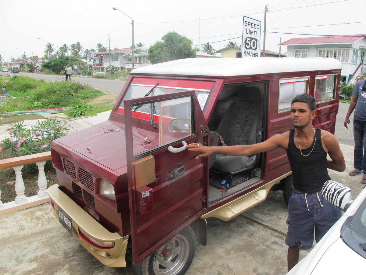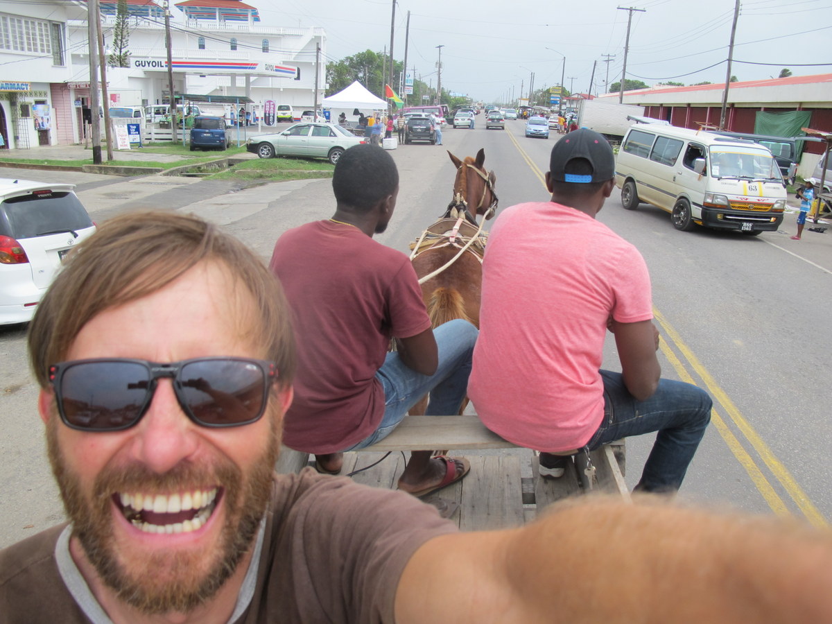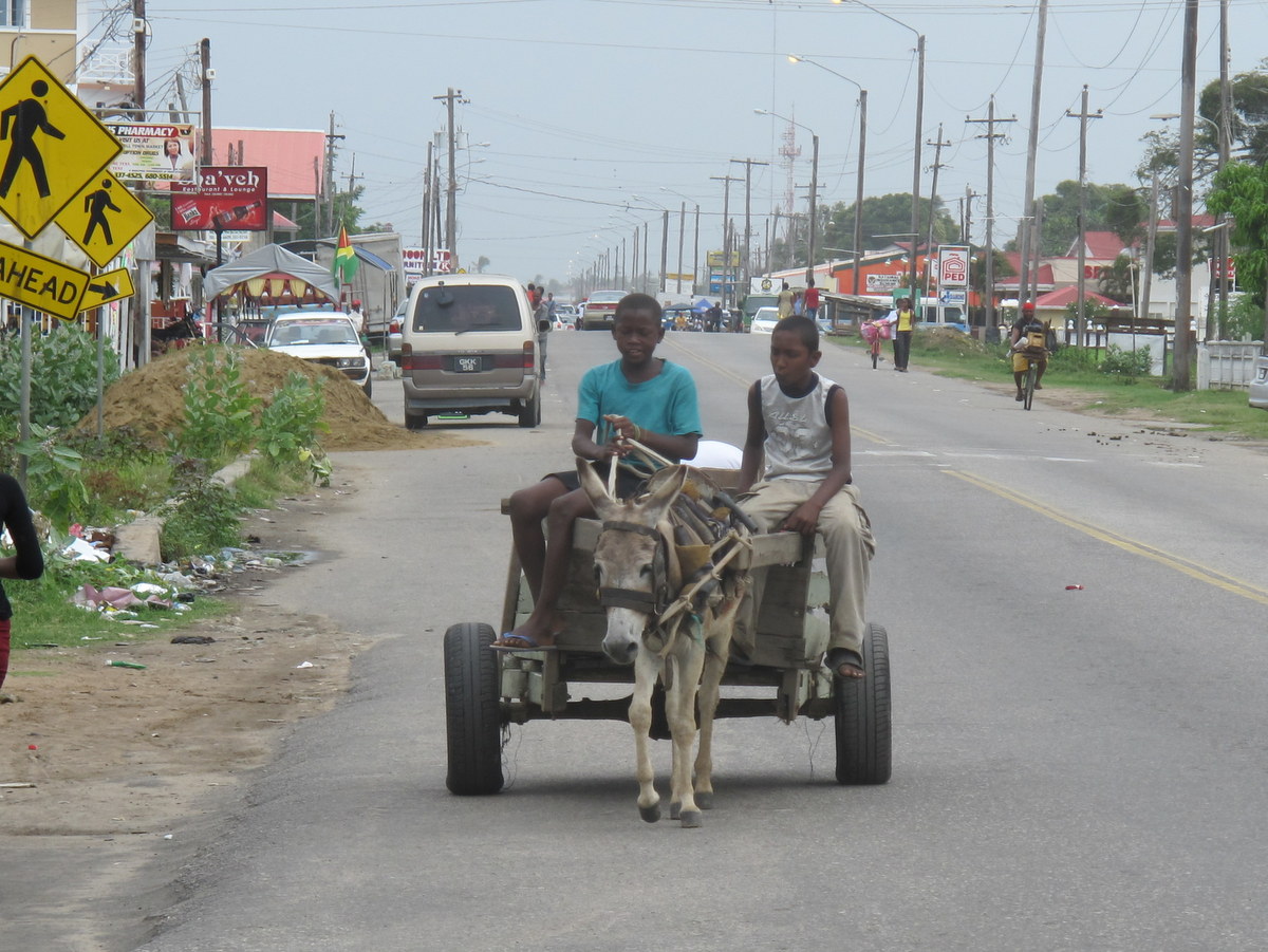Zurück zu Guyana. Ein gut zu bereisendes Land. Die Landessprache ist Englisch, es herrscht Linksverkehr, viele LKWs, Pick-ups, Pferdewagen, Kleinbusse, alles, was das Tramperherz begehrt.