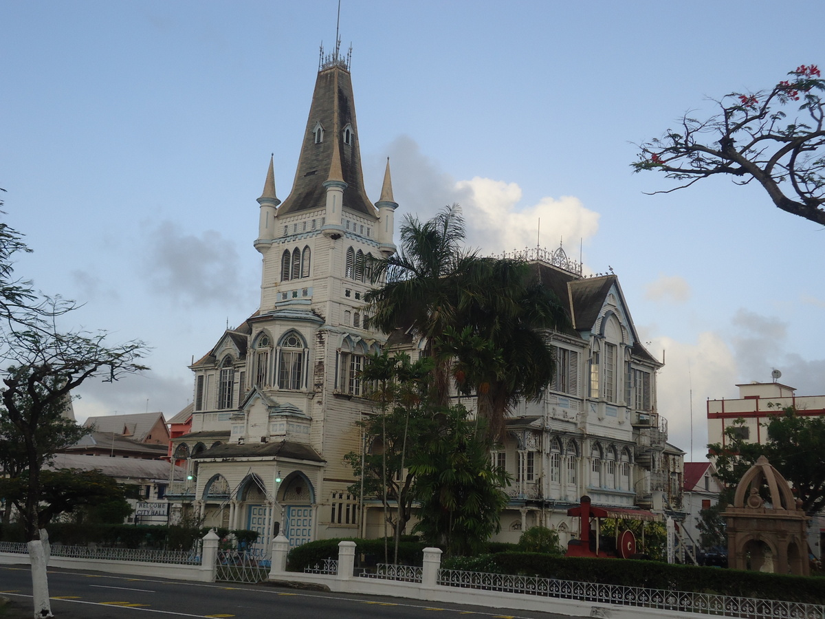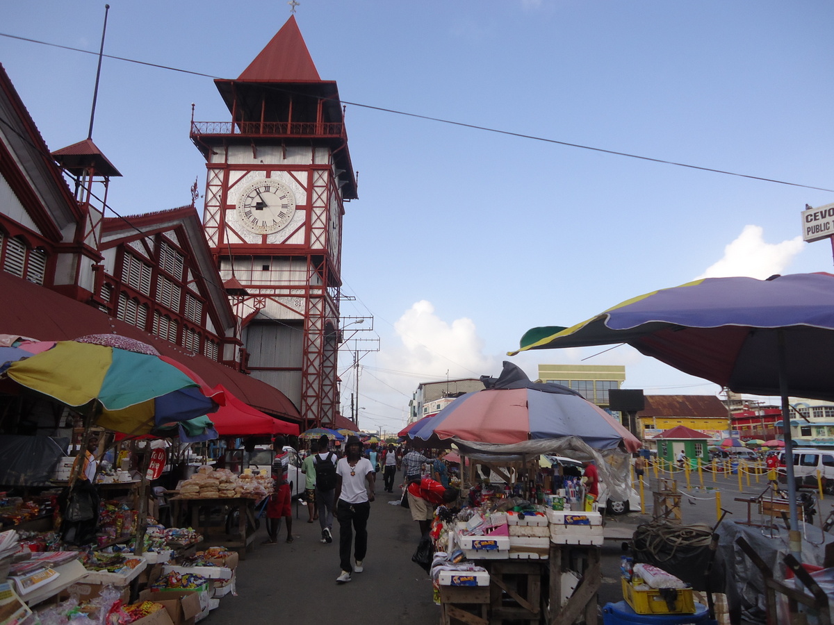 Nun sind wir endlich in Georgetown, der Hauptstadt Guyanas. Eine heruntergekommene Stadt mit 200.000 Einwohnern aber riesig und weiträumig. Sie ist von unzähligen Kanälen zerschnitten, um den sumpfigen Untergrund zu entwässern. Kanäle voll stinkenden Wassers, Mücken und Plastemüll. Direkt daneben verkaufen Frauen Früchte. Das Stadtzentrum ist zum Fürchten. Koloniale Holzbauten, die von der guten kolonialen viktorianischen Zeit künden. Sie künden allerdings auch davon, wie lange diese Zeit schon her ist.