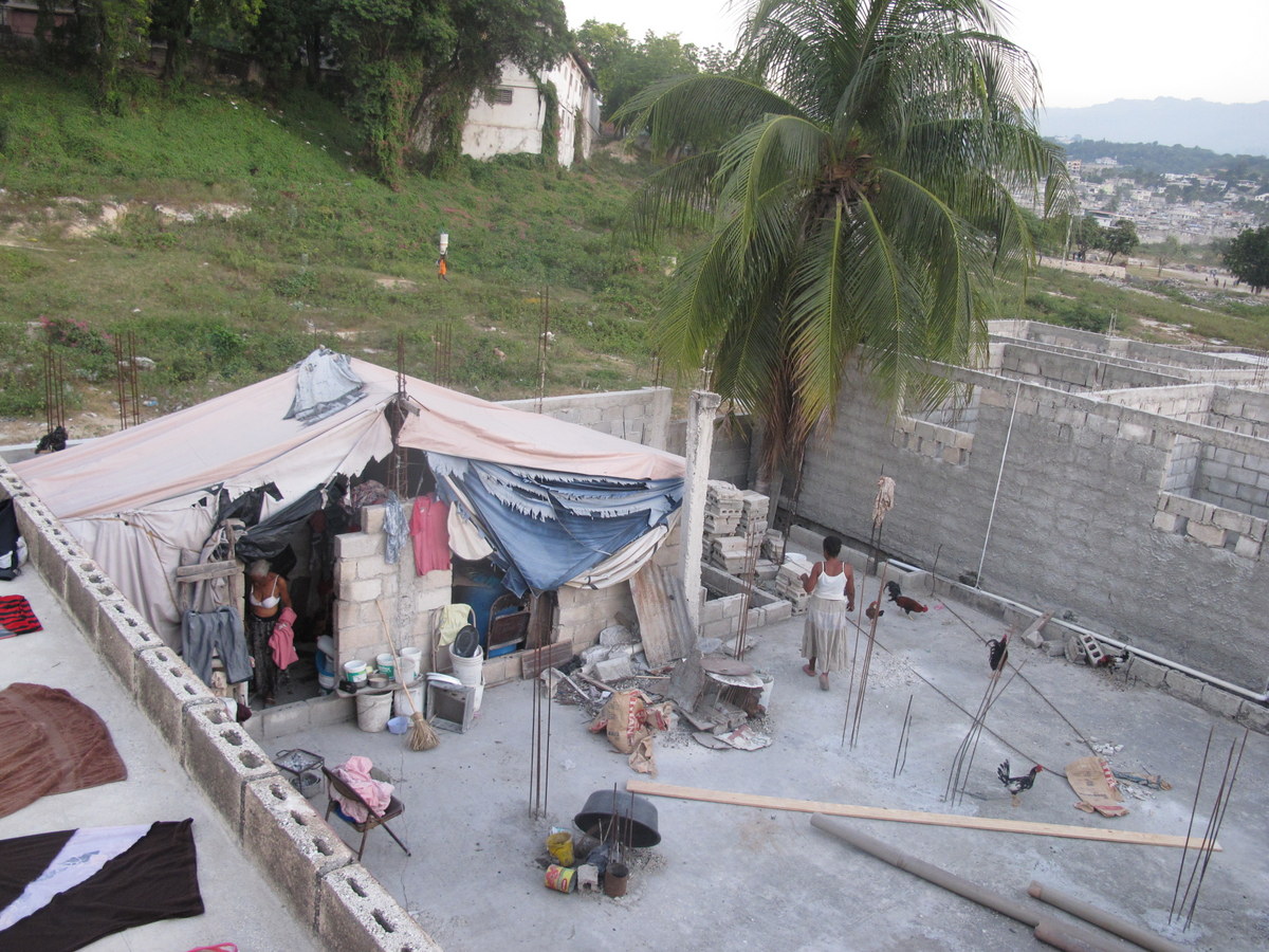 Er wohnt bei einer anderen Familie mit zur Untermiete. Ein Plumpsklo, das sie sich mit anderen Mietern teilen, eine Treppe runter. Kein Bad, kein fließendes Wasser. Mitten in der Hauptstadt Port-au-Prince. Aber es geht schlechter. Vom Dach aus, konnte ich sehen, wie die Nachbarn leben.