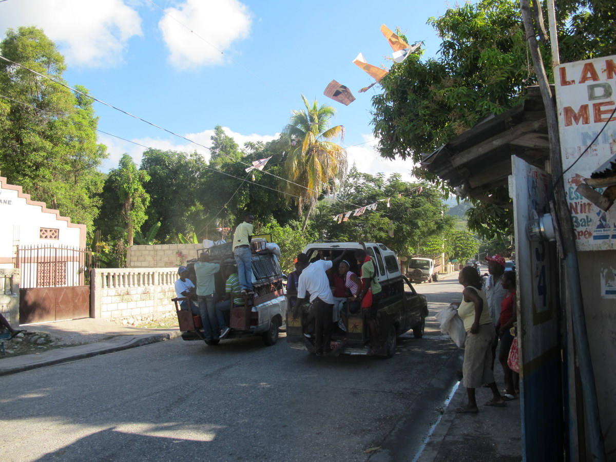 Dann war es leider schnell mit der guten Straße vorbei. Vorher bin ich noch ein paar Kilometer auf LKW Ladeflächen, im klimatisierten Jeep und auf einem Busdach gefahren. Da war plötzlich nur noch Schotterpiste. Ich hatte keine Ahnung, dass sie Hunderte Kilometer andauern würde und mehrere Tage. Ich bin also ganz munter drauf los gelaufen, Richtung Jacmel, erst nach einiger Zeit in der unträglichen Hitze wurde mir klar, was die Haitianer meinen, wenn sie sagen, man könne es nicht laufen. Dann kann man es auch nicht laufen. Und ich schon gar nicht!