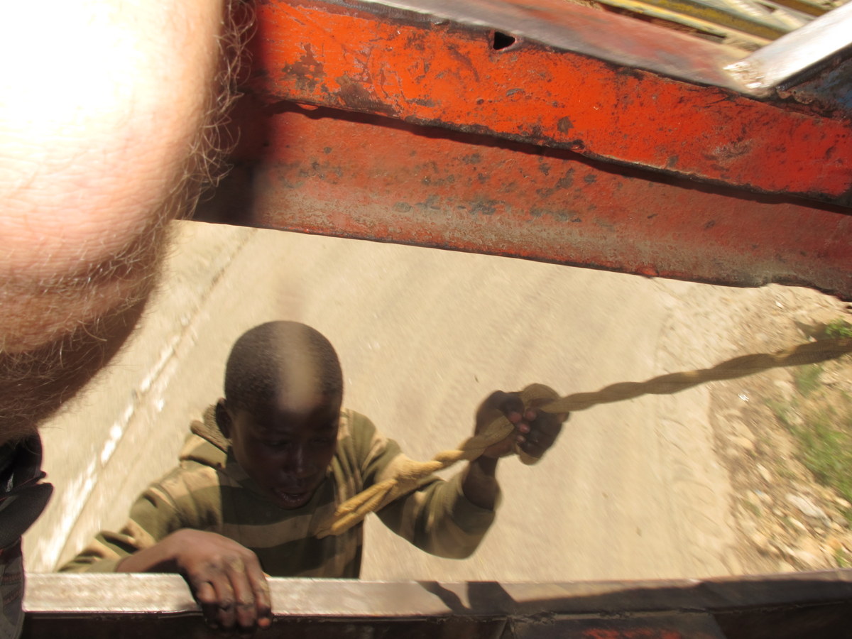 Schnell war der Asphalt wieder vorbei und es gab wieder Piste. Wie die anderen Jungs, habe ich mich auch an allem Fahrbaren festgekrallt. Dabei waren die Straßen unbeschreiblich schlecht, so dass man immer auf der Hut sein mußte, beim nächsten Schlagloch oder bei der nächsten Bodenwelle abgeworfen zu werden. Immer wieder haben sich auch Kinder hinten an den LKW geklammert, um einige Kilometer mitzufahren.
