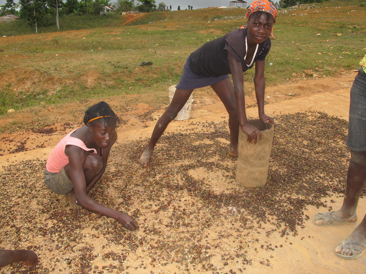 Weiter, vorbei an Frauen, die Kaffee auf der Straße schälen.